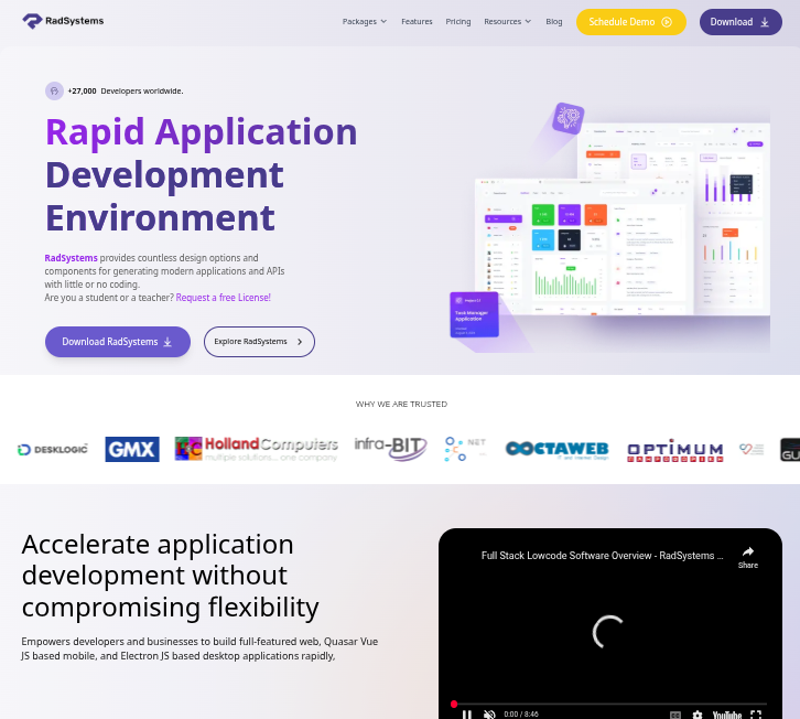 RadSystems is a low-code rapid application development platform used by over 27,000 developers to generate modern web, mobile, and desktop applications with clean, production-ready code across multiple frameworks.